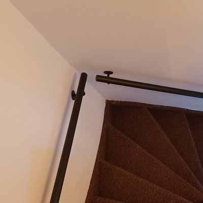 LET OP: Deze leuning wordt niet voorgeboord en exclusief leuningdragers geleverd. Er worden wel twee kleine gaatjes in de trapleuning gemaakt, om de leuning vast te zetten tijdens het coatingsproces. Indien gewenst kunt u de gewenste positie van deze gaatjes aan ons doorgeven, zodat deze samenvallen met de door u beoogde leuningdragers.