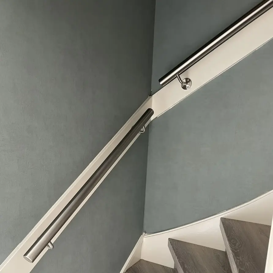 Inox trapleuning - volledig gelast - rond - incl. dragers TYPE 1 + bevestigingsmaterialen - OP MAAT - van 30 cm t/m 595 cm lang - geborsteld 304 INOX (voor binnen). Deze ronde INOX trapleuning heeft een diameter van 42,4 mm, betreft 304 INOX (voor binnen) en heeft een subtiele geborstelde afwerking. Deze ronde leuning combineert een klassieke trapleuning vorm met de moderne uitstraling van INOX. Toegankelijke trapleuningen van RVS die in de meeste interieurstijlen naadloos toegepast kunnen worden.