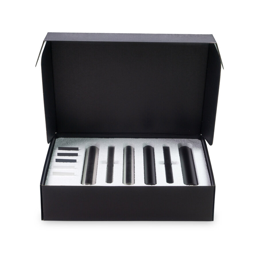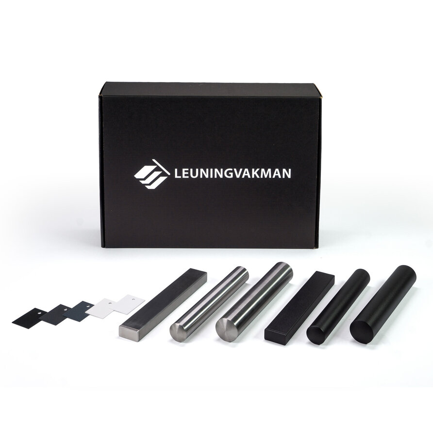 Samplebox trapleuningen (46x34x11 cm) - B2B groothandel trapleuning collectie - bevat de inox leuningen rond, rond smal en 40x20 mm - en de zwarte (fijnstructuur) leuningen rond, rond smal en 40x20 mm - 25 cm lang, 1 zijde met dop, 1 zijde dichtgelast - incl. kleur / coating stalen: zwart (RAL 9005), antraciet (RAL 7016 & RAL 7021), wit (RAL 9016 & 9010).