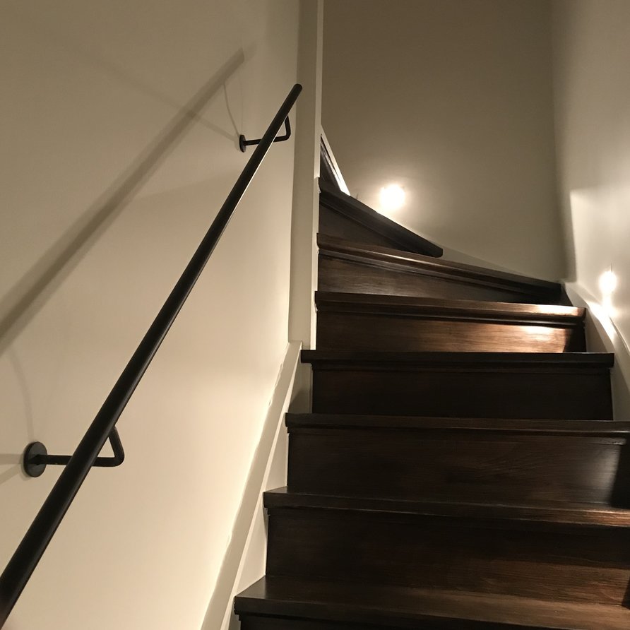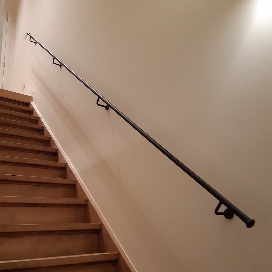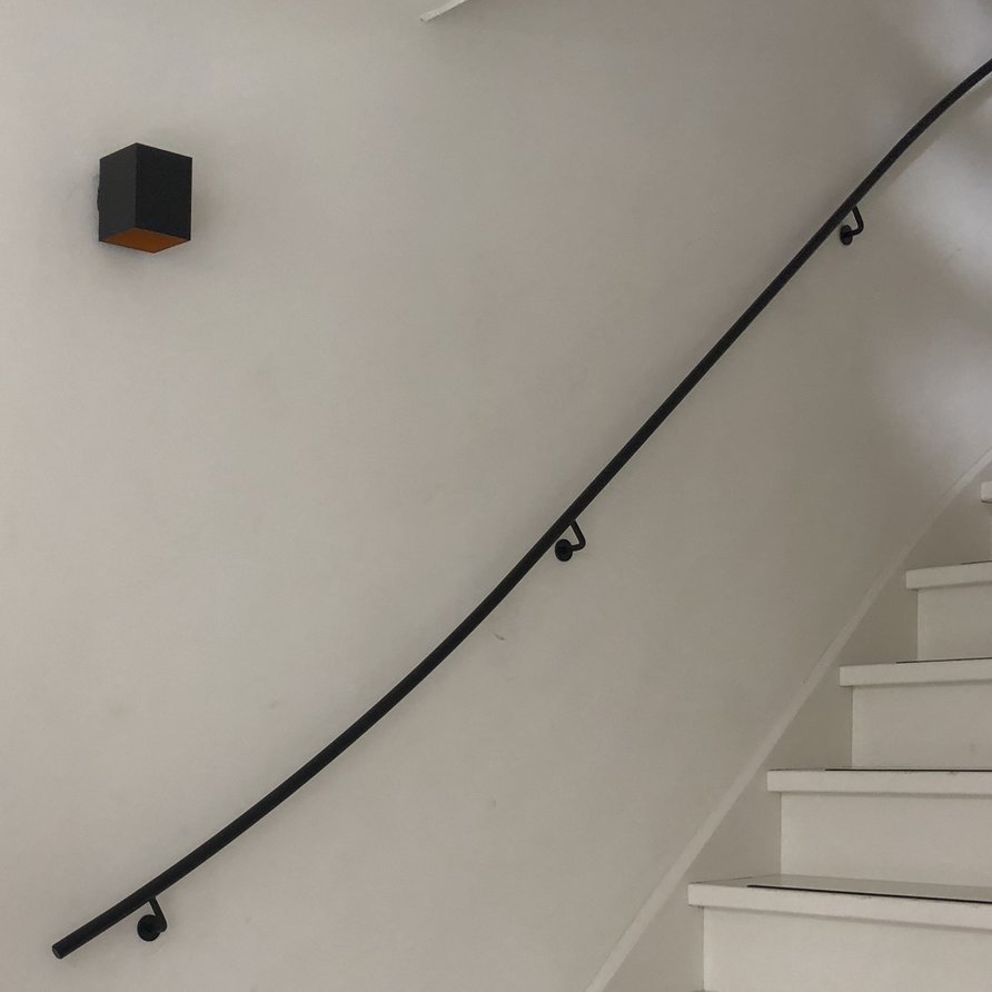 Een prachtige slanke smeedijzeren trapleuning - matzwart gecoat - met ronde leuningdragers incl. rozet (blind). Niet alleen een mooie trapleuning, maar vooral ook een bijzonder interieurobject: Slank & stoer met een modern tintje. Lees meer