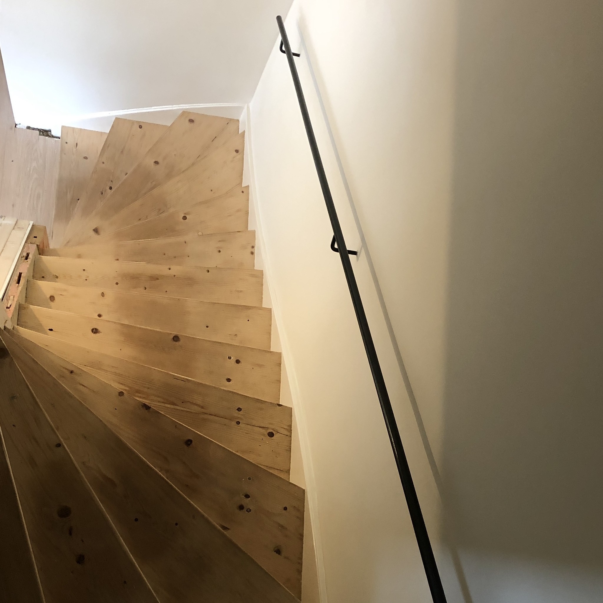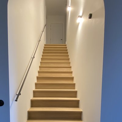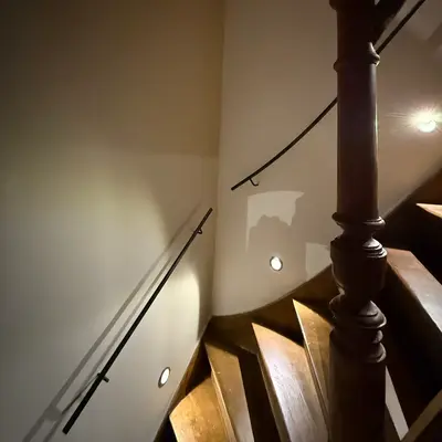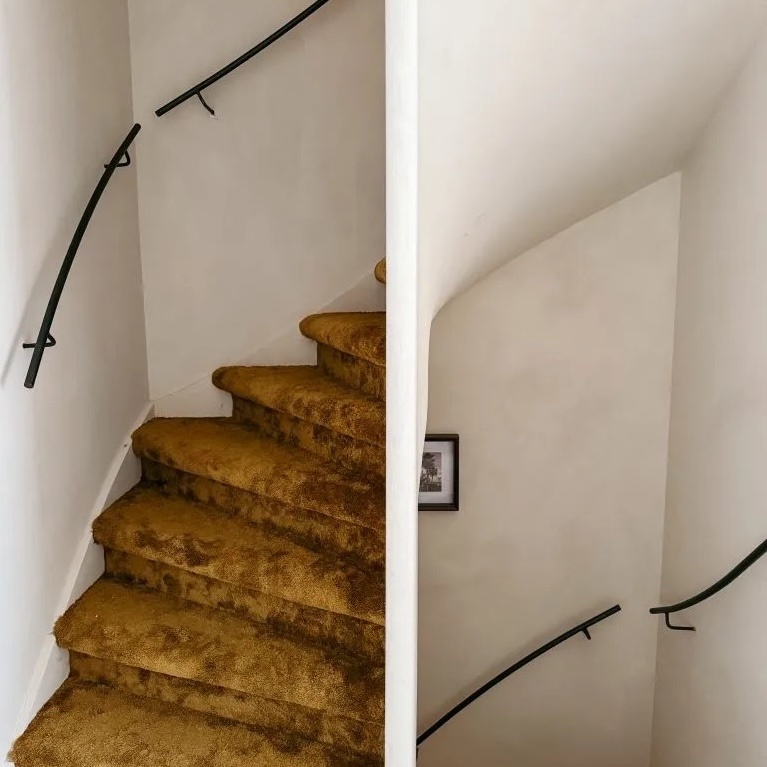 Een prachtige slanke smeedijzeren trapleuning - transparant gecoat - met ronde leuningdragers (blind). Niet alleen een mooie trapleuning, maar vooral ook een bijzonder interieurobject: Slank & stoer met een vleugje klassiek, bomvol karakter! Lees meer
