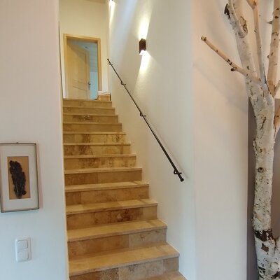 Een prachtige slanke smeedijzeren trapleuning - transparant gecoat - met recht;e leuningdragers (blind). Niet alleen een mooie trapleuning, maar vooral ook een bijzonder interieurobject: Slank & stoer met een vleugje klassiek, bomvol karakter! Lees meer
