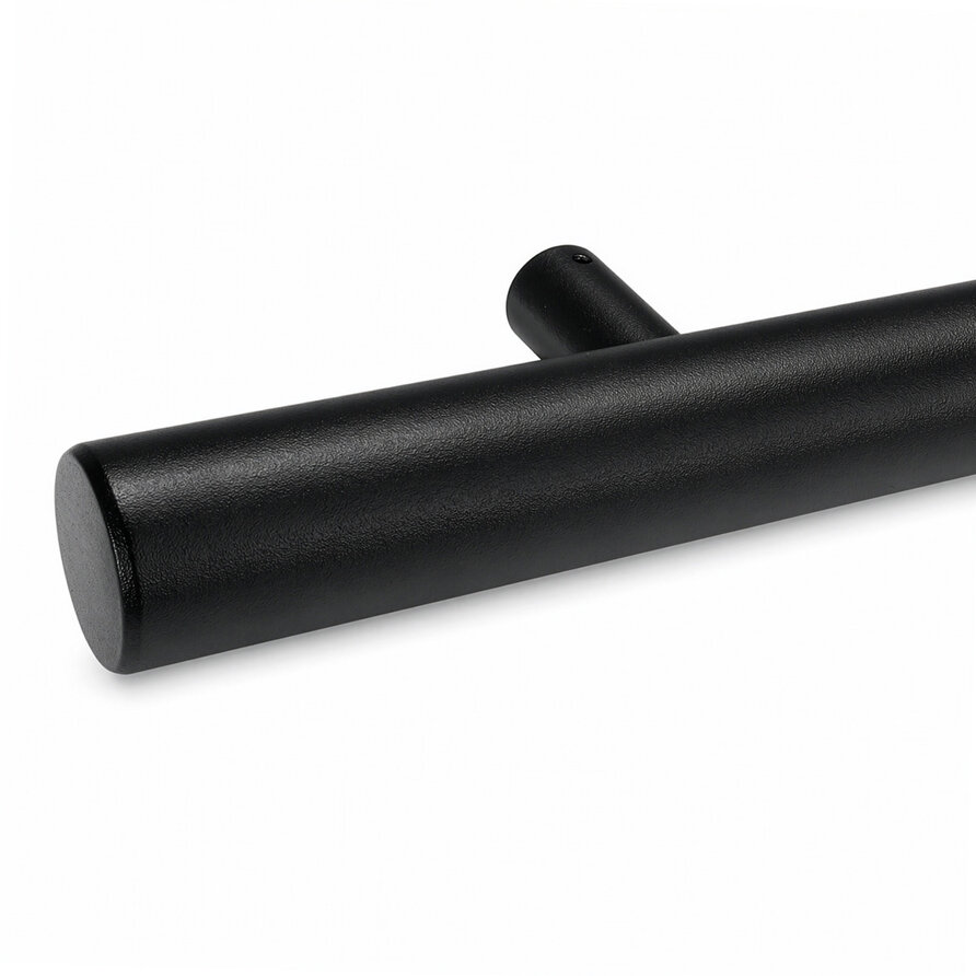 Zwarte trapleuning - speciaal geschikt voor buitengebruik - rond - incl. dragers TYPE 14 + bevestigingsmaterialen - OP MAAT - van 30 cm t/m 595 cm lang - fijnstructuur poedercoating in RAL 9005 zwart (voor buiten). De ronde zwarte trapleuning van staal heeft een diameter van 42,4 mm en is voorzien van een hoogwaardige fijnstructuur poedercoating in de zwarte kleurtint RAL 9005 (gitzwart). Voor extra bescherming tegen de (weers)invloeden bij buiten plaatsing, is deze trapleuning 2 laags (dubbel) gecoat. Voor buitengebruik bieden wij bewust alleen onze fijnstructuur coating aan, aangezien deze sterker & minder kwetsbaar is t.o.v. een gladde coating. Een klassieke trapleuning in de kleur zwart, die zorgt voor een moderne uitstraling met een stoer accent! De uiteinden van deze buitenleuning worden altijd naadloos dichtgelast en vervolgens mooi afgeslepen, voor een strakke en mooi afgewerkte trapleuning die optimaal beschermd is voor buiten. Deze leuning(drager) is geschikt voor verticale & horizontale plaatsing. Denk hierbij bijv. aan een railing op een muurtje, zoals een stenen (trap)balustrade, of als extra verticale “handgreep” bij uw trap.