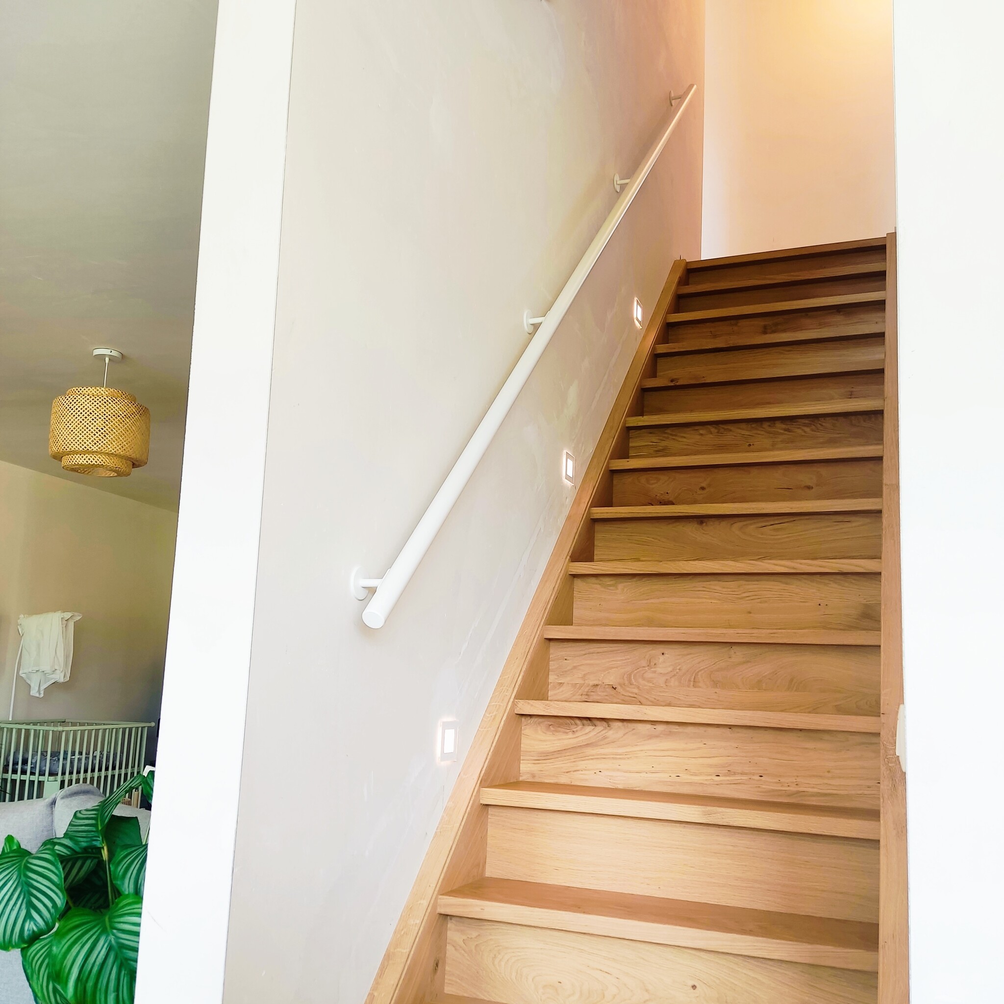 Een toegankelijke witte trapleuning met moderne type 5 leuningdragers. Deze ronde leuning past in vrijwel iedere interieurstijl en wordt - in een lengte op maat - compleet incl. dragers + bevestigingsmaterialen geleverd. Lees meer