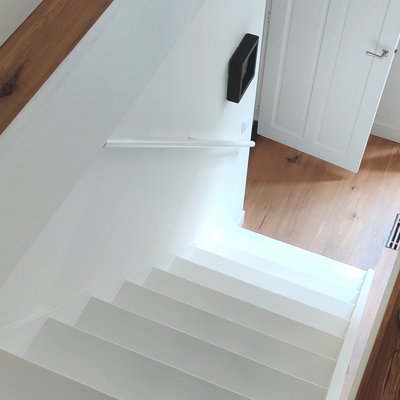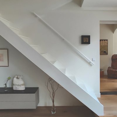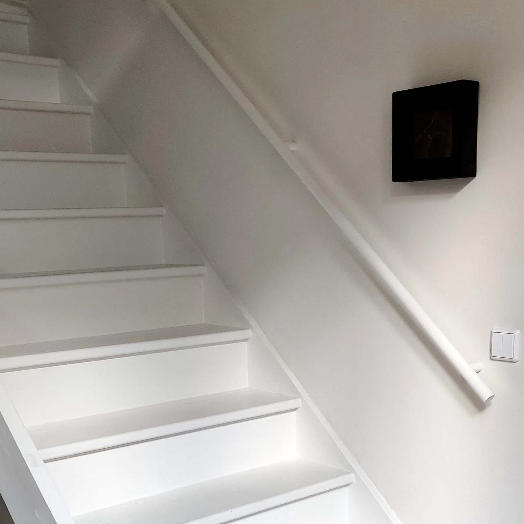 Een toegankelijke witte trapleuning. Deze ronde leuning past in vrijwel iedere interieurstijl en wordt in een lengte op maat geleverd. Lees meer