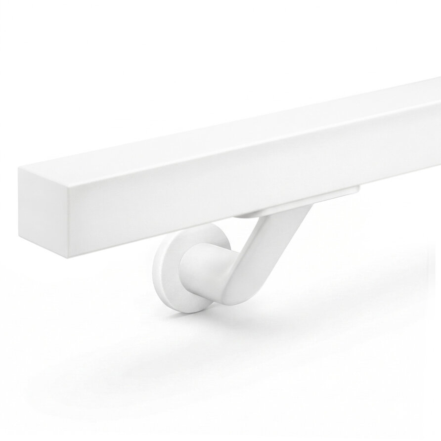 Een vierkante witte trapleuning met stijlvolle TYPE 7 LUXE leuningdragers. Deze robuuste 40x40 mm leuning past mooi in een modern & industrieel interieur en wordt - in een lengte op maat - compleet incl. dragers + bevestigingsmaterialen geleverd. Lees meer