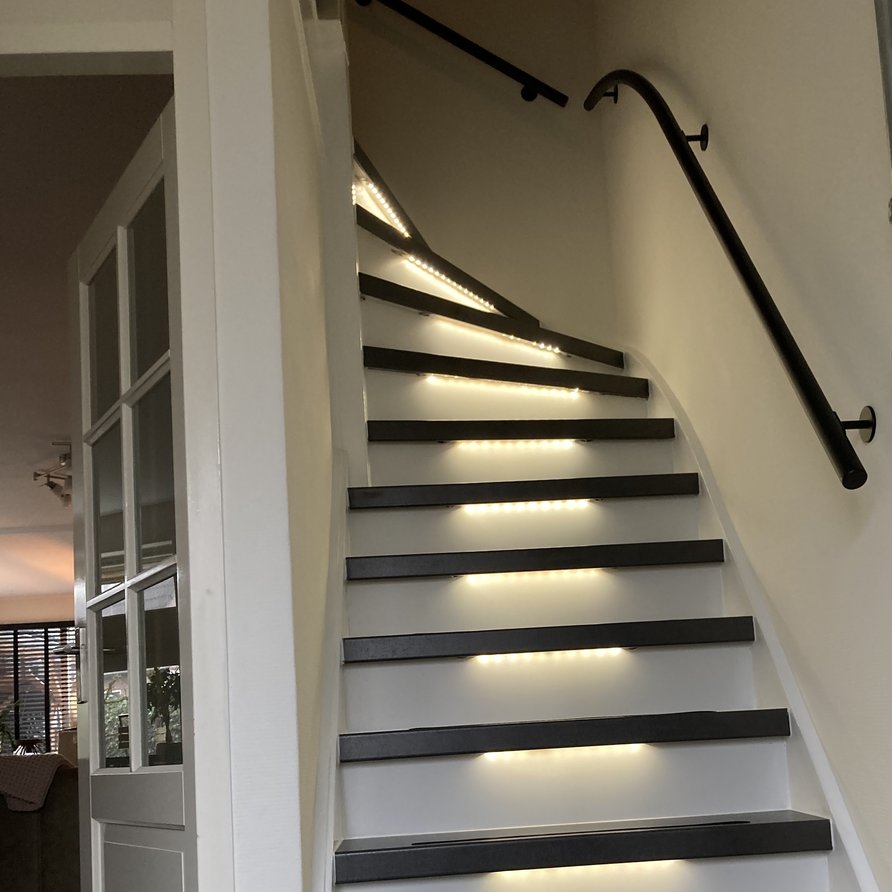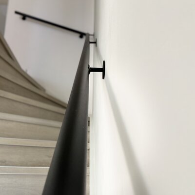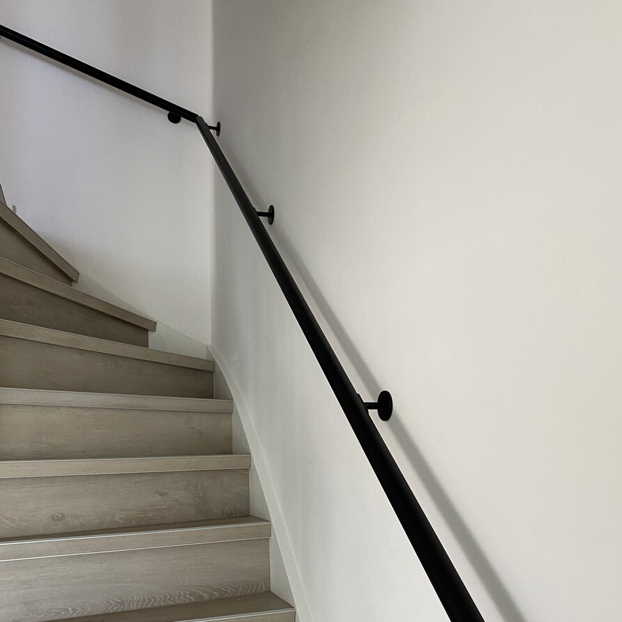 Een toegankelijke zwarte trapleuning met moderne type 5 leuningdragers. Deze ronde leuning past in vrijwel iedere interieurstijl en wordt - in een lengte op maat - compleet incl. dragers + bevestigingsmaterialen geleverd. Lees meer