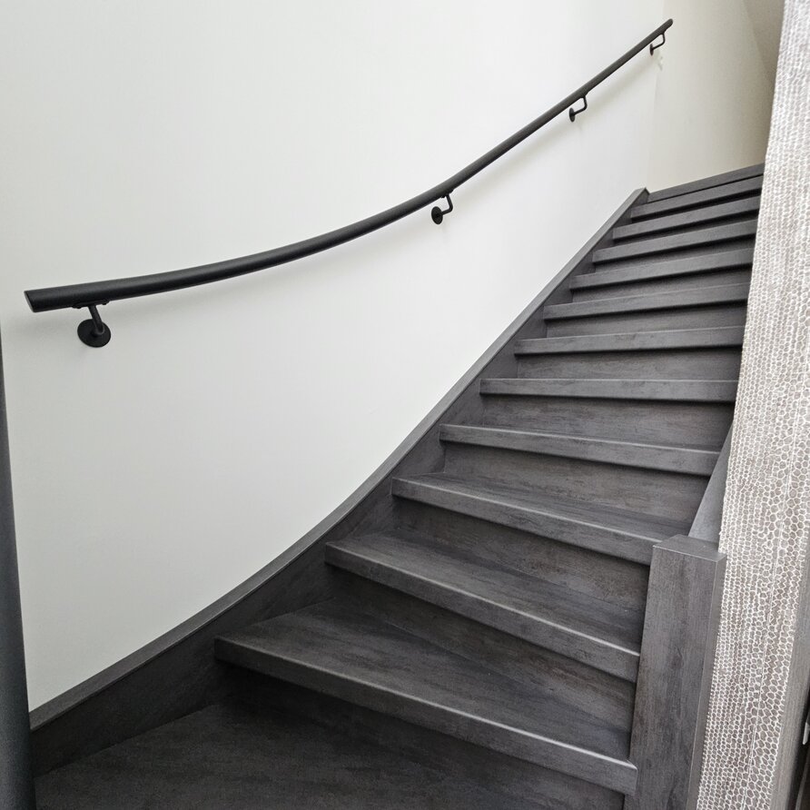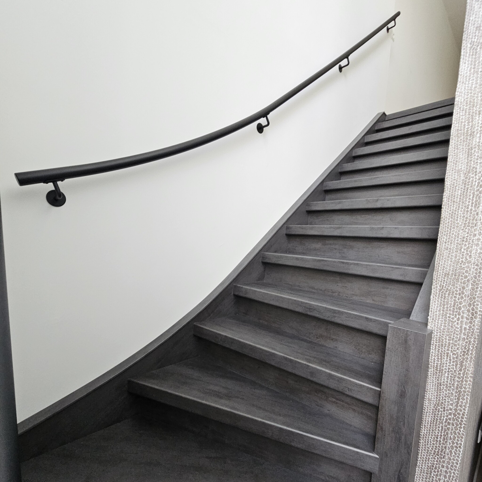 Een toegankelijke zwarte trapleuning met moderne type 3 leuningdragers. Deze ronde leuning past in vrijwel iedere interieurstijl en wordt - in een lengte op maat - compleet incl. dragers + bevestigingsmaterialen geleverd. Lees meer