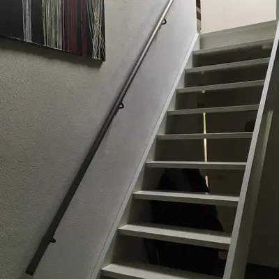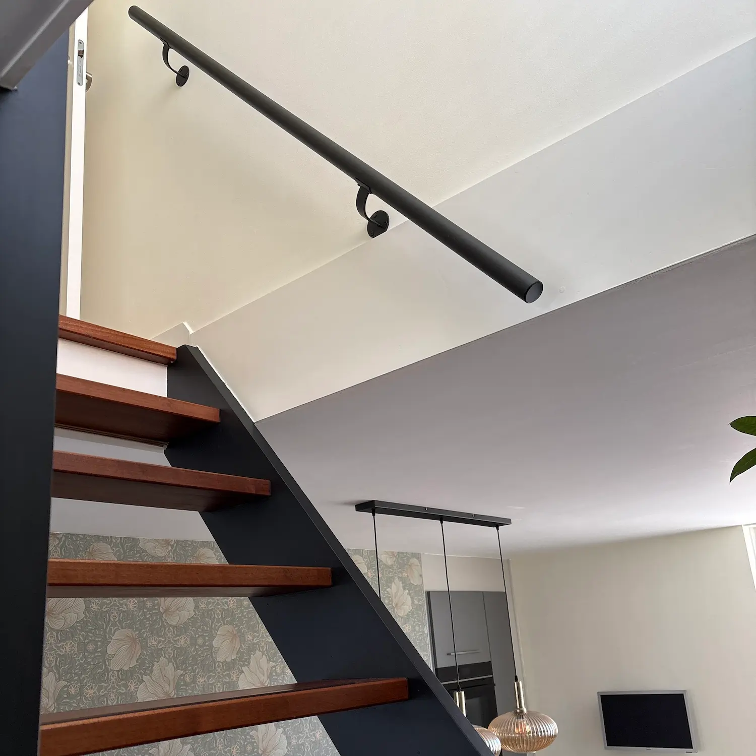 Een toegankelijke zwarte trapleuning. Deze ronde leuning past in vrijwel iedere interieurstijl en wordt in een lengte op maat geleverd. Lees meer