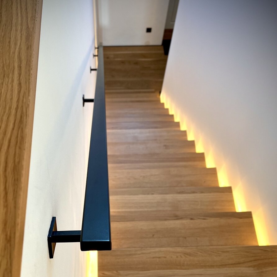 Zwarte trapleuning - rechthoekig (40x15 mm) - incl. dragers TYPE 11 + bevestigingsmaterialen - OP MAAT - van 30 cm t/m 595 cm lang - poedercoating in RAL 9005 zwart fijnstructuur of glad (voor binnen). Deze rechthoekige zwarte trapleuning van staal heeft een "dikte" van 40x15 mm en is voorzien van een hoogwaardige poedercoating in de zwarte kleurtint RAL 9005 (gitzwart). Hierbij heeft u de keuze uit een trapleuning zwart in RAL kleur 9005 met een fijnstructuur of een gladde coating. De zwarte 40x15 mm trapleuning oogt - naast strak - ook elegant & modern. Een stijlvolle trapleuning zwart met stoer accent, ideaal geschikt voor een moderne en trendy interieurstijl. De uiteinden van deze leuning worden altijd naadloos dichtgelast en vervolgens mooi afgeslepen, voor een strakke en mooi afgewerkte trapleuning.