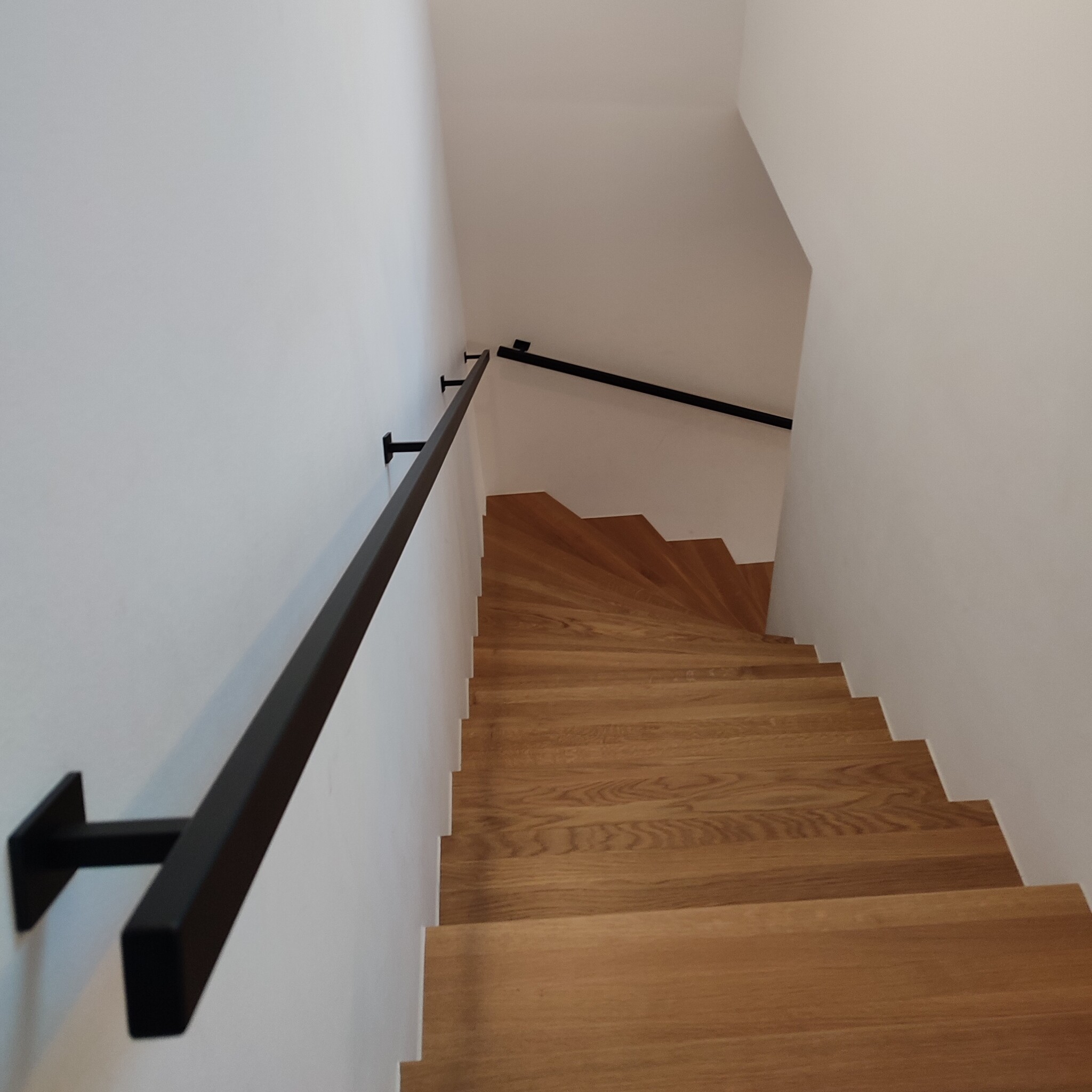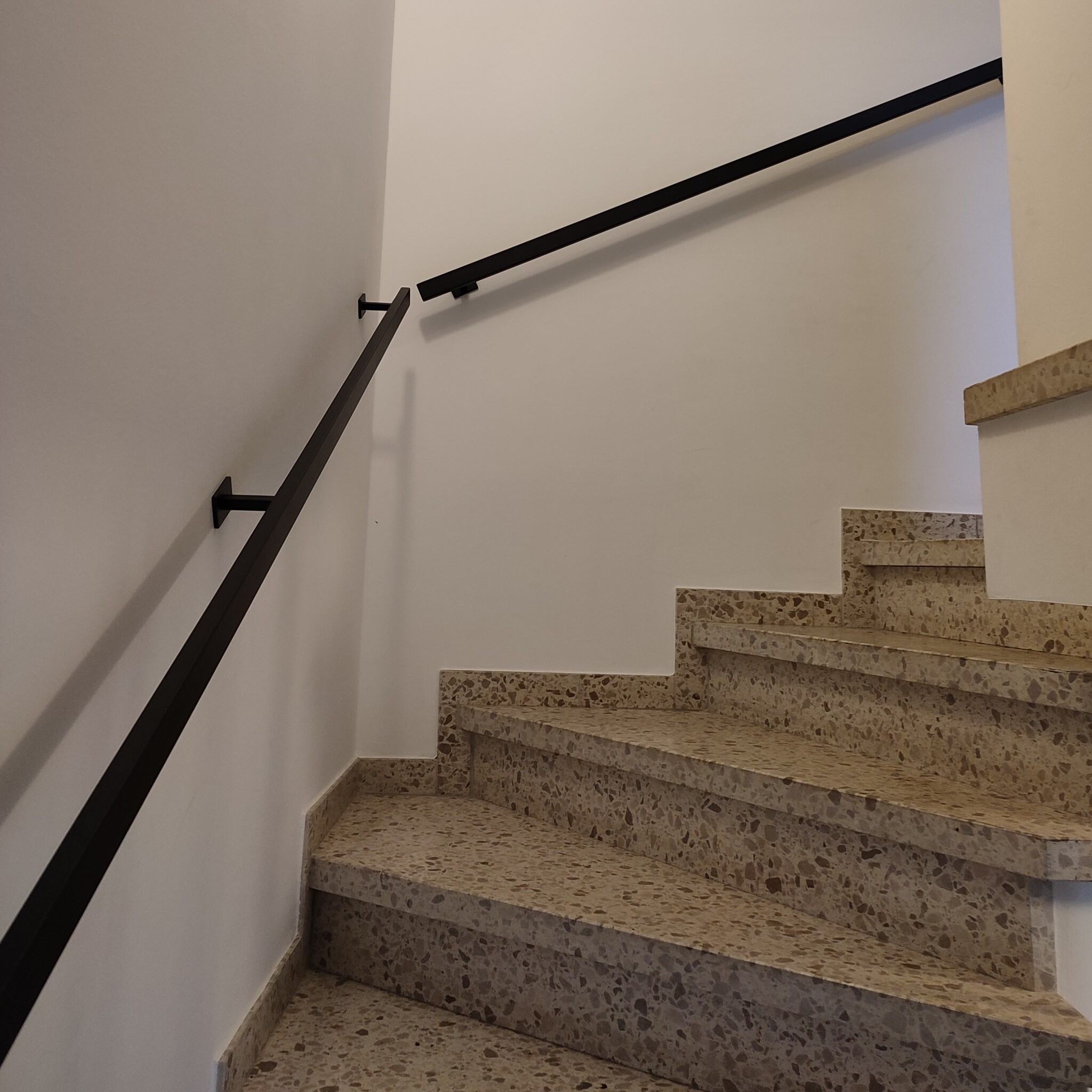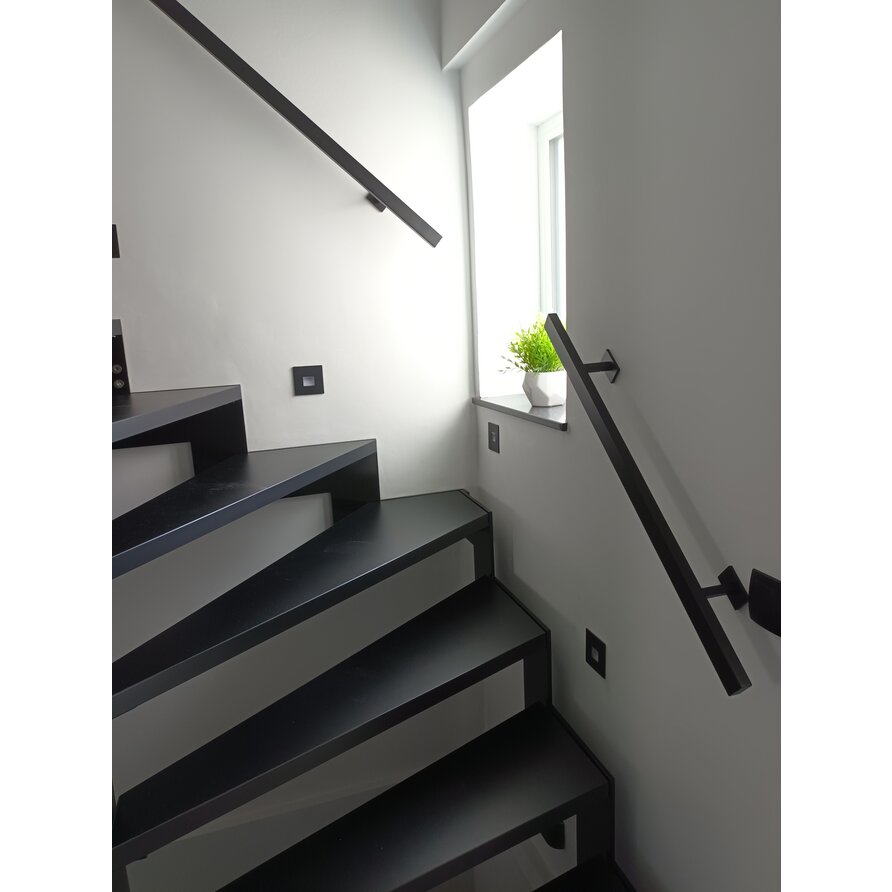 Een toegankelijke zwarte trapleuning met strakke type 16 leuningdragers. Deze rechthoekige leuning past in vrijwel iedere moderne interieurstijl en wordt - in een lengte op maat - compleet incl. dragers + bevestigingsmaterialen geleverd. Lees meer
