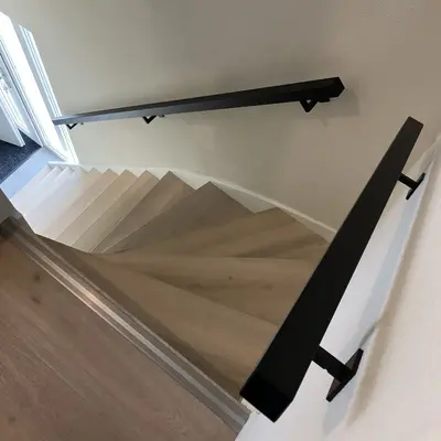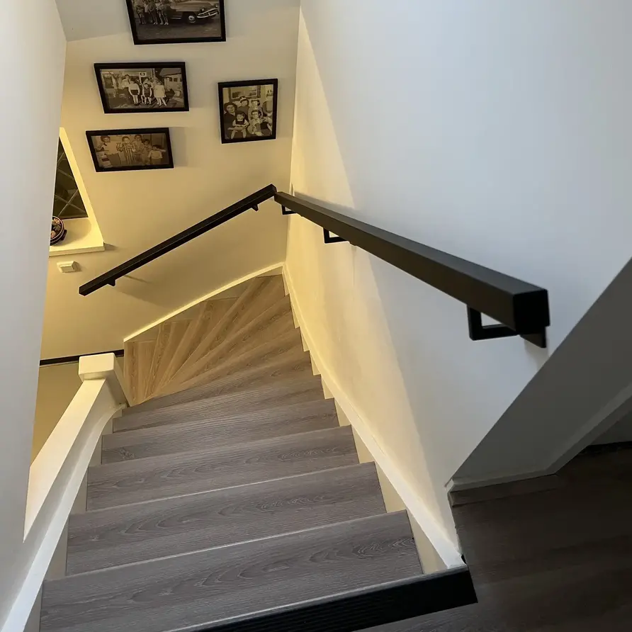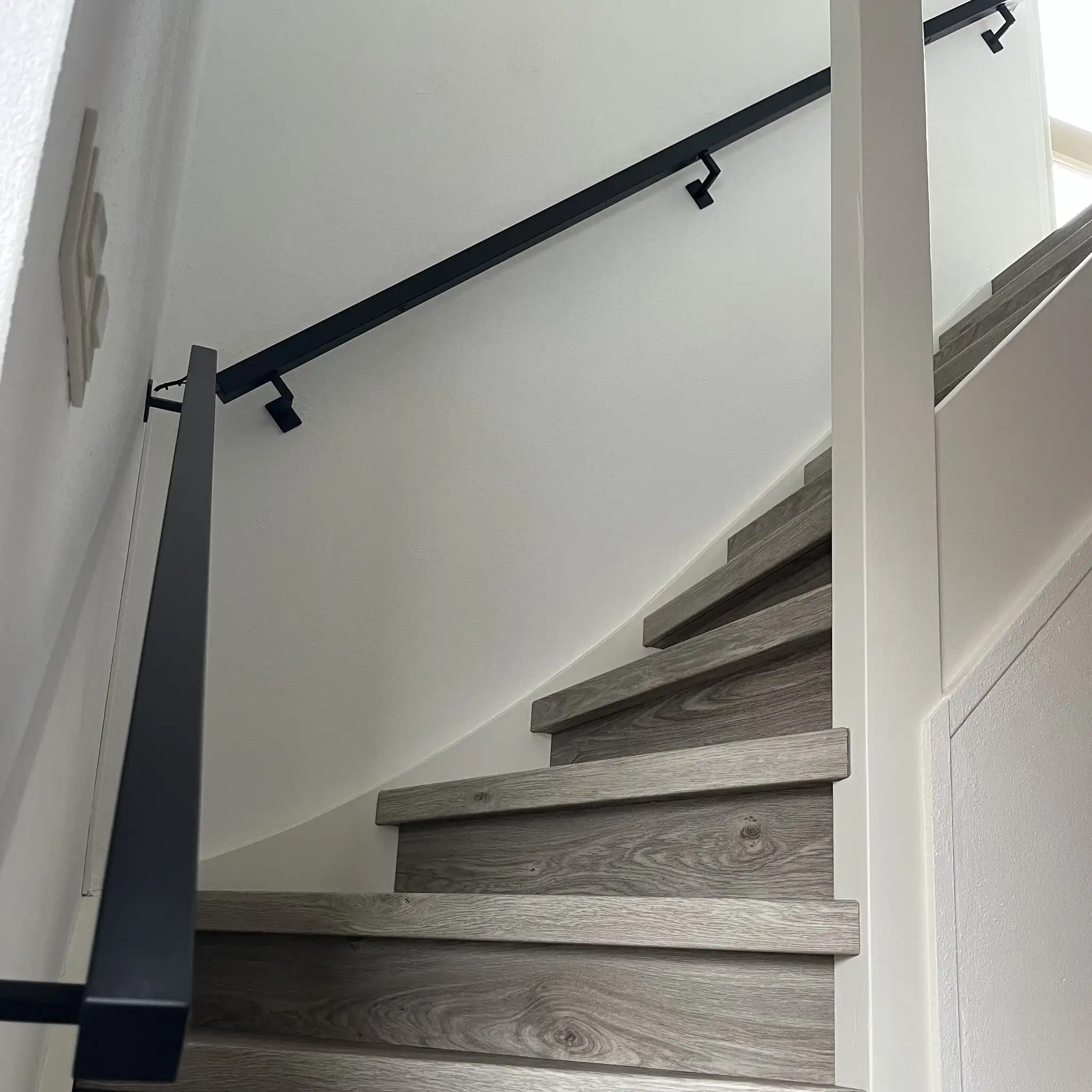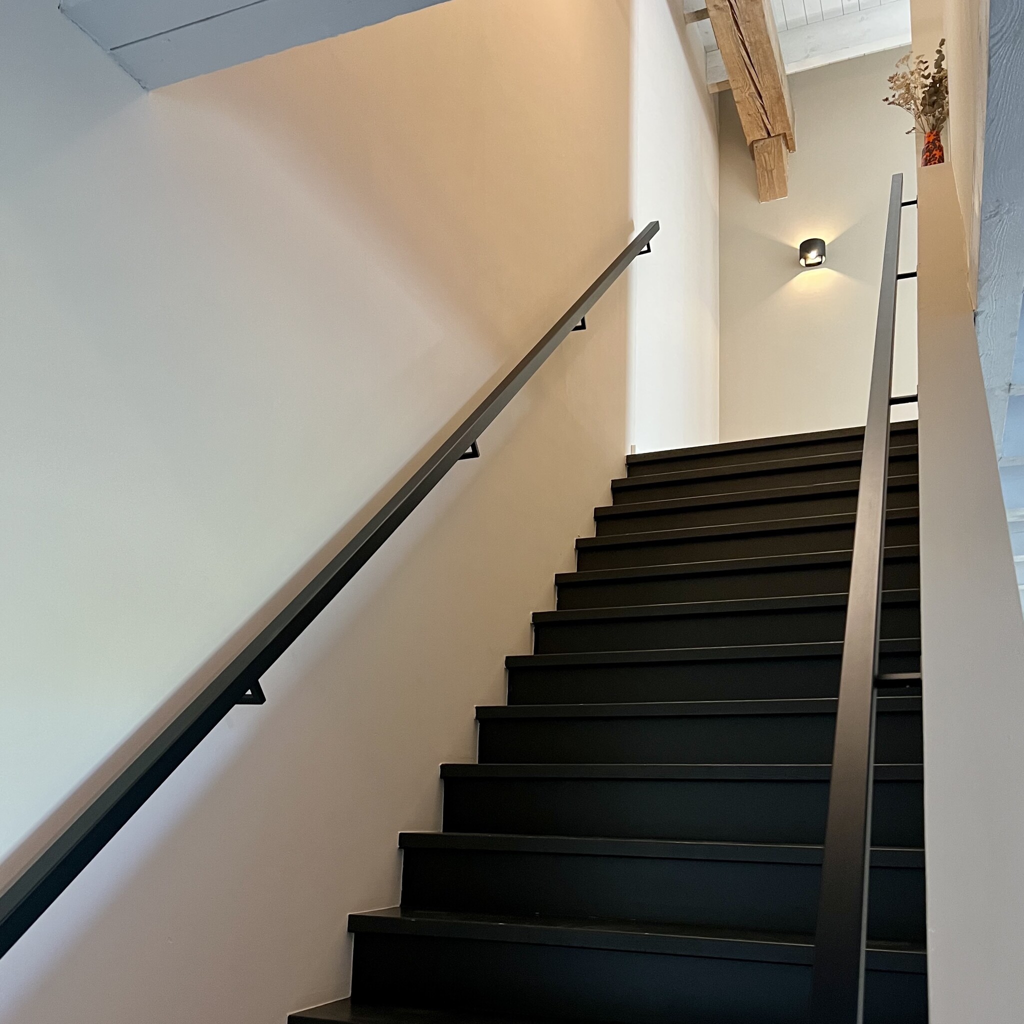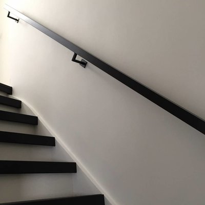 Een vierkante zwarte trapleuning met stijlvolle type 11 leuningdragers. Deze robuuste 40x40 mm leuning past mooi in een modern & industrieel interieur en wordt - in een lengte op maat - compleet incl. dragers + bevestigingsmaterialen geleverd. Lees meer
