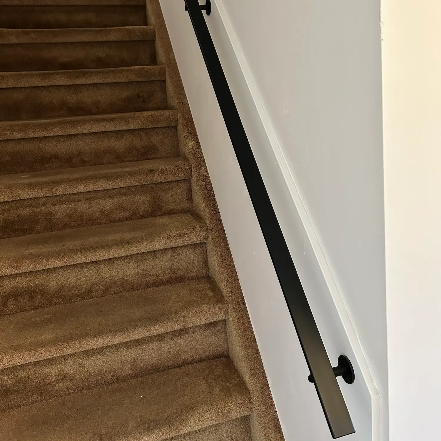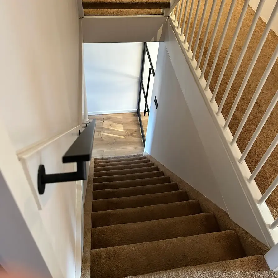 Een slanke zwarte trapleuning met trendy TYPE 3 LUXE leuningdragers. Deze rechthoekige leuning past mooi in een moderne & trendy interieurstijl en wordt - in een lengte op maat - compleet incl. dragers + bevestigingsmaterialen geleverd. Lees meer